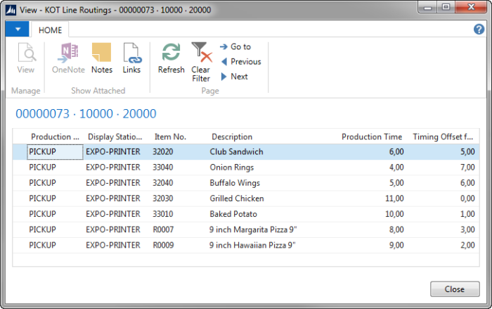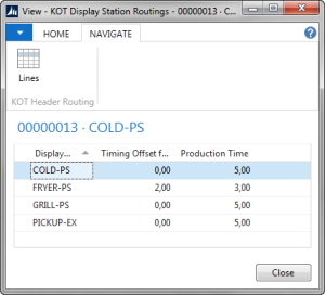 In KOT Display Station Routings all display stations for the selected KOT are displayed with Production time and Timing Offset for the order: