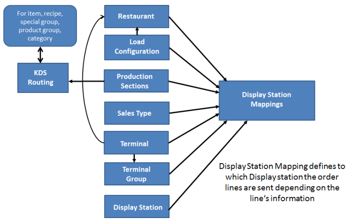 A vital part of a successful kitchen production system is to have a flexible item routing to the display stations and printers in the kitchen. For the KDS system, the routing is divided into two parts to minimize the setup.