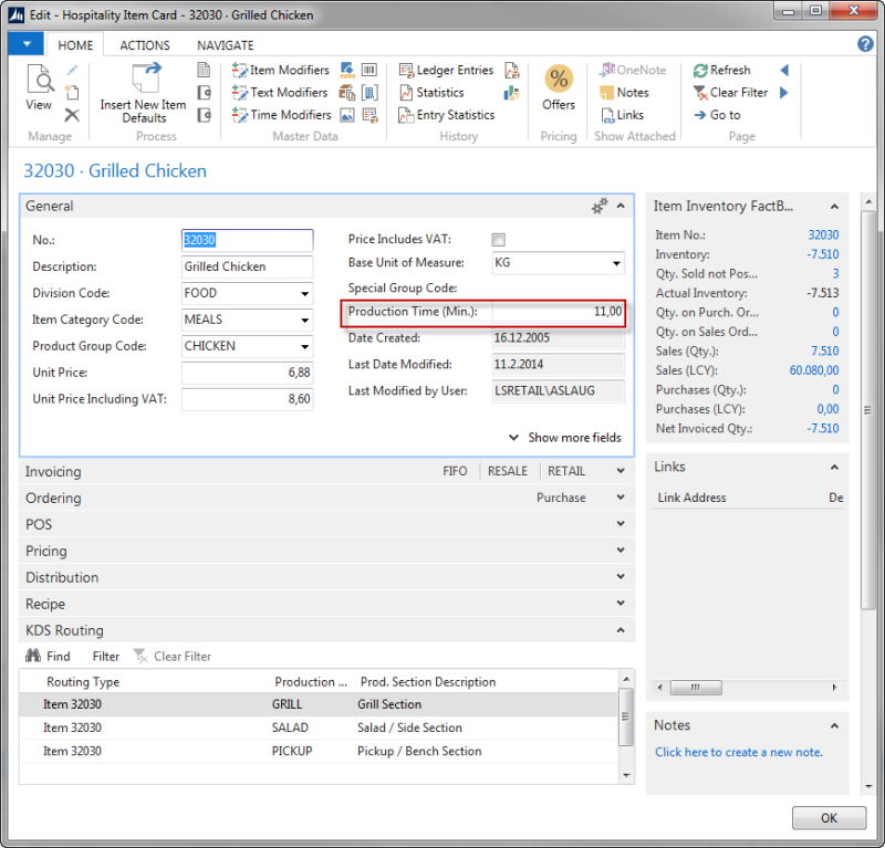 To set the production time you fill in the field Production Time (Min.) on the General FastTab for Hospitality Item and Recipe.