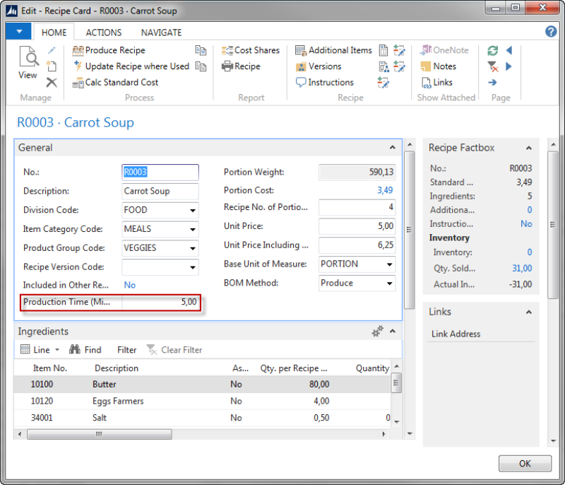 - Two items, Grilled Chicken and Carrot Soup. In this example they are set up so that the Grilled Chicken has Production Time11 min. and CarrotSoup5 min.