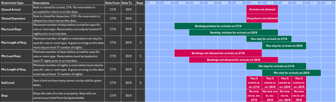 Restrictions is a tool to control and influence the occupancy and room rate for the hotel. See Examples at the bottom of this page for a graphic display of the restrictions with examples.