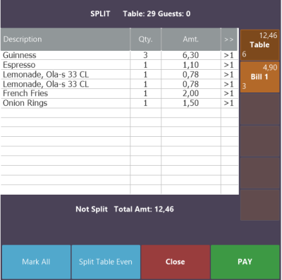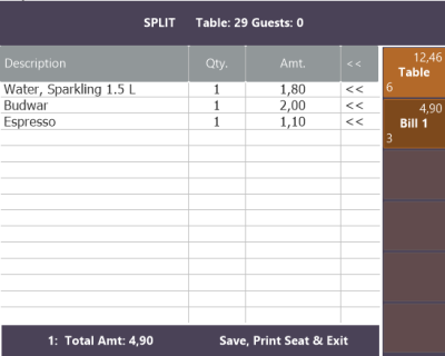 This example is the POS P0080 Bar in S0005 - phone layout, one bill only , automatically selected.