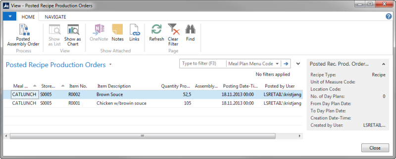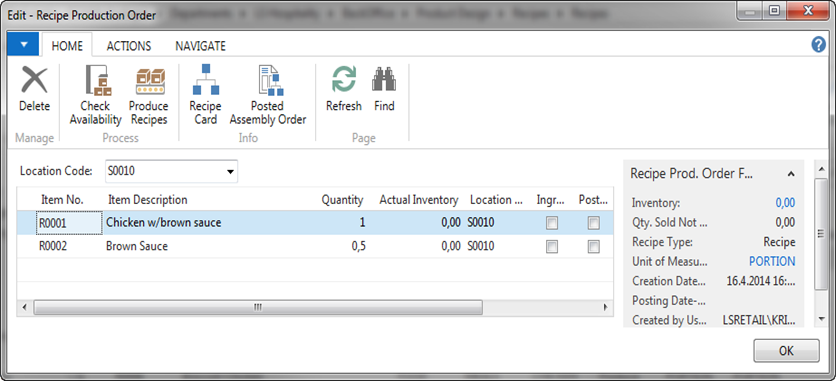 - On the Actions menu, click Produce Recipe. The Recipe Production Order page appears with a line for the recipe you selected in addition to recipes that are ingredients: