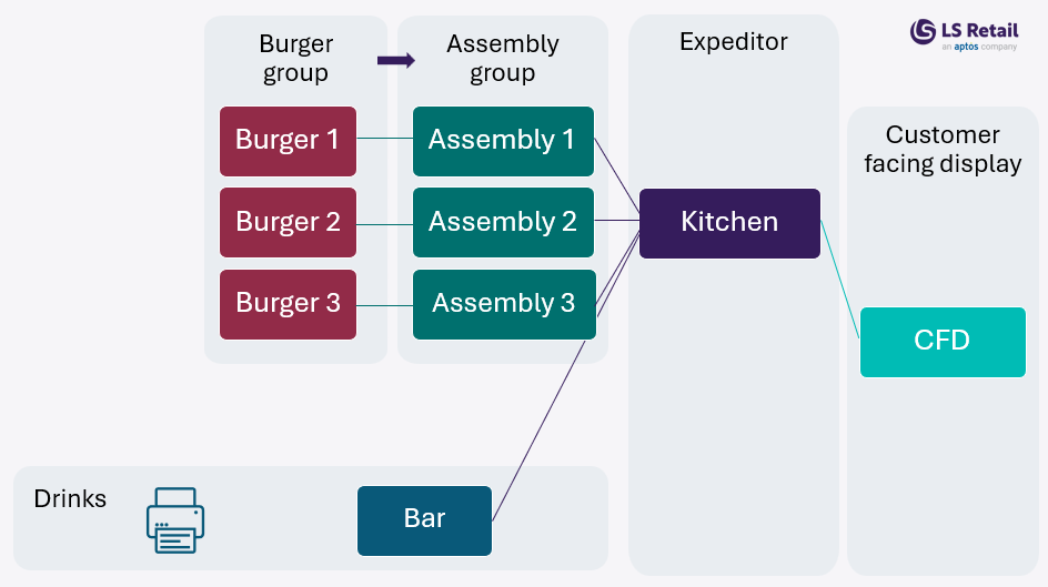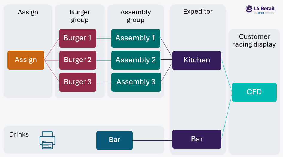 Example: In a big burger place where there are three burger grills and three assembly stations, one for each of the grills, they have an assign station before the group of burger grills. All burger orders start at the assign station and kitchen staff then assigns each of the burger order lines to one of the burger stations. The assign operation prompts the user to select one of the burger stations.