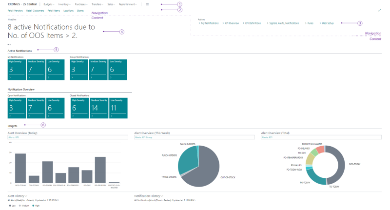 | 3 | Action bar | The action bar provides links to the most often used tasks and operations required. The links are displayed on the root-level and also grouped in a submenu. The objects targeted by these links open in a separate window in front of the Action Hub page. The most often used tasks and operations required in the Action Hub are My Notifications, KPI Overview, KPI Definitions, Signals, Alerts, Notifications, Rules, and User Setup. |