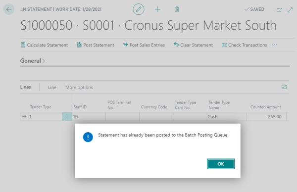 - Open a statement, and post the statement as usual. This message is displayed: