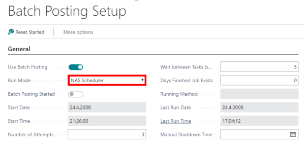 - Open the Batch Posting Setup page, and in the Run Mode field, select NAS Scheduler :