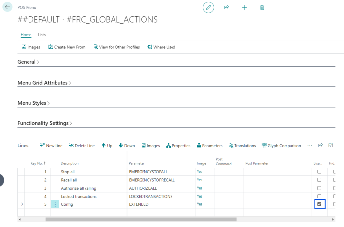 - Select the Global Actions menu (##DEFAULT #FRC_GLOBAL_ACTIONS), and enable the Config description by clearing the Disabled check box in the Lines section.