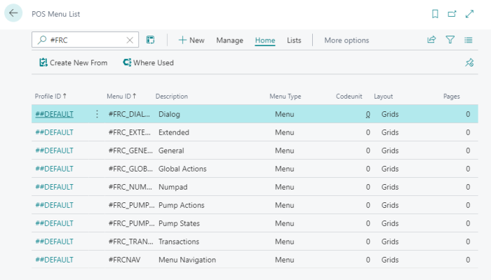 Open the POS Menu List, and type #FRC in the search field. All the menus that define the Forecourt ribbon UI style are displayed: