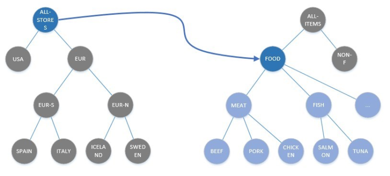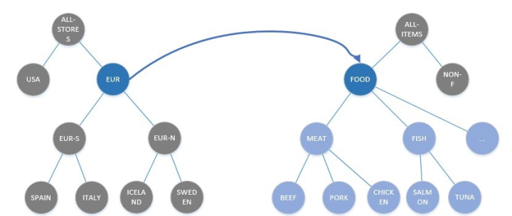 In the above example a Relation between the Nodes ALL-STORES and FOOD exists. The Node FOOD has child Nodes MEAT, FISH, and DAIRY, which have further child Nodes like CHICKEN, BEEF, and so on. The child Nodes and their child Nodes will inherit the Relation settings of their parent Nodes.