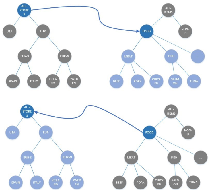 As a result, the rlation between the nodes EUR and FOOD and all child relations are removed. This affects the child nodes FISH, SALMON, TUNA, and so on.