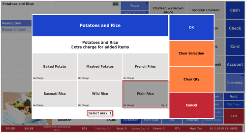 The Potatoes and Rice item modifier is triggered by request and has max. selection 1.