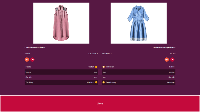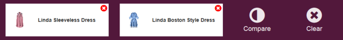 The Product Compare feature is used to compare two items and the attributes assigned to them. To compare, click the Compare icon on the items that you want to compare. This sends the items to a small panel at the bottom of the brick view. There you can clear the items from the compare selection or click Compare to open the Compare panel.