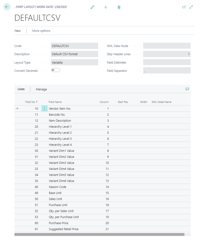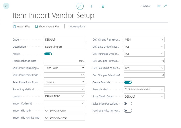 The name of the file can be of your choice, for example item.csv. - To import the file, use action Import Files under Item Import on the Retail Vendor Card:
