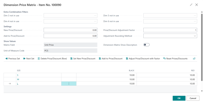 If you have enabled the new pricing feature for Business Central, the item prices are maintained using the Sales Price List and Purchase Price List. LS Central provides you with the functionality to maintain the prices for variants using the Dimension Price Matrix, which is a page that gives you an overview of all the variants belonging to an item, grouped according to their variant dimensions.
