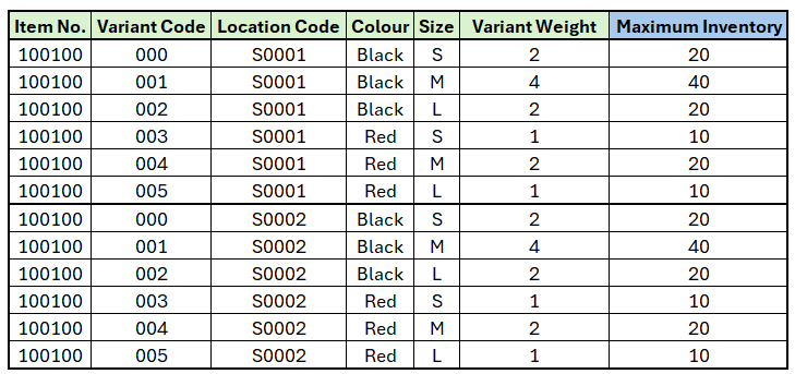 The Maximum Inventory is broken down in the Item Store Records as follows: