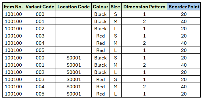 The break down of Reorder Point and Maximum Inventory is grouped according to the locations that are set up in the Item Store Records. Item Store Records without Location Code are considered a group on its own. Note: Only Item Store Records with Variant Code defined are considered for the break down.