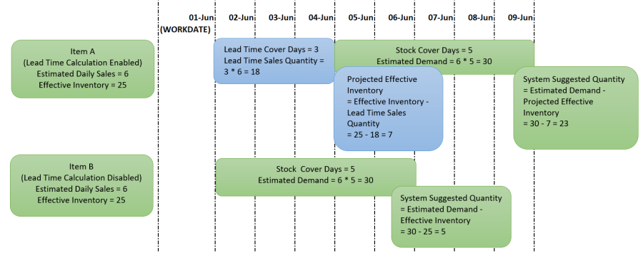 Item A has Lead Time Calculation enabled while Item B has the setting disabled. The replenishment parameters like Estimated Daily Sales, Effective Inventory, and Stock Cover Days are the same for both items. However, when calculating the replenishment for Item A, the Lead Time Calculation will be carried out, which will yield a different System Suggested Quantity than Item B. This is because, the Lead Time Calculation will take into consideration the estimated sales during the Lead Time Coverage Period and calculate the Projected Effective Inventory value at the beginning of the stock coverage period. This projected value will affect the System Suggested Quantity calculation for Item A, unlike Item B, which uses the Effective Inventory as of the day of calculation.