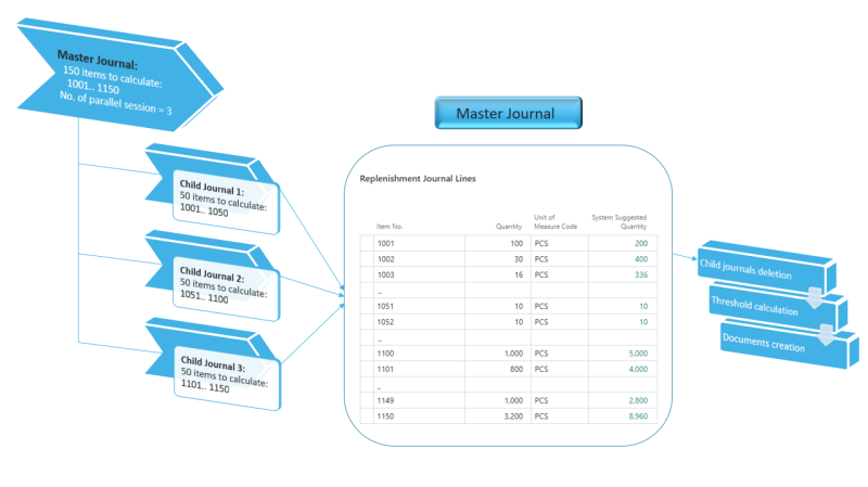 The Child journals calculate and create the lines in the journal according to their respective item range. The Master journal monitors the progress of the Child journals, and once the calculations are finished for all Child journals, the Master journal proceeds to delete the Child journals. The Master journal continues with the threshold calculation and order document creation, if necessary.