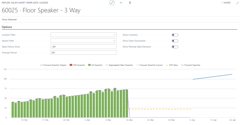 • Forecast Quantity (Planned Sales Dem.): A graph of the estimated sales demand for the item, considering any Planned Sales Demand defined over the forecast period range. This is calculated based on the Forecast Quantity value. If you want to view this information, select the Show Planned Sales Demand check box on the Options FastTab. This check box is exclusive for Replenishment Calculation Type Average Usage.