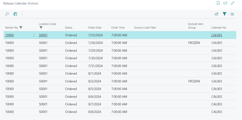 The number of release actions that are created depends on the Release Details Period setting in the Replen. Setup. Once created, these actions are automatically maintained by the system (once an action is processed from the top of the list, a new one is generated at the bottom of the list), as long as no changes occur on the calendars, links, and the vendors or locations.