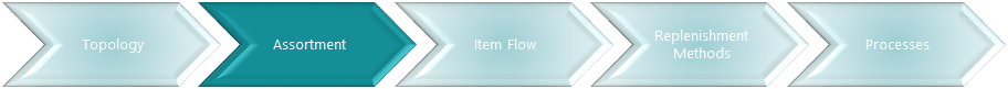 In this model the stores are organized in a hierarchical store group. The items are organized in a hierarchical item group. The assortment is defined by relations between the item and store hierarchy entries. This approach works with inheritance and a top-down approach.