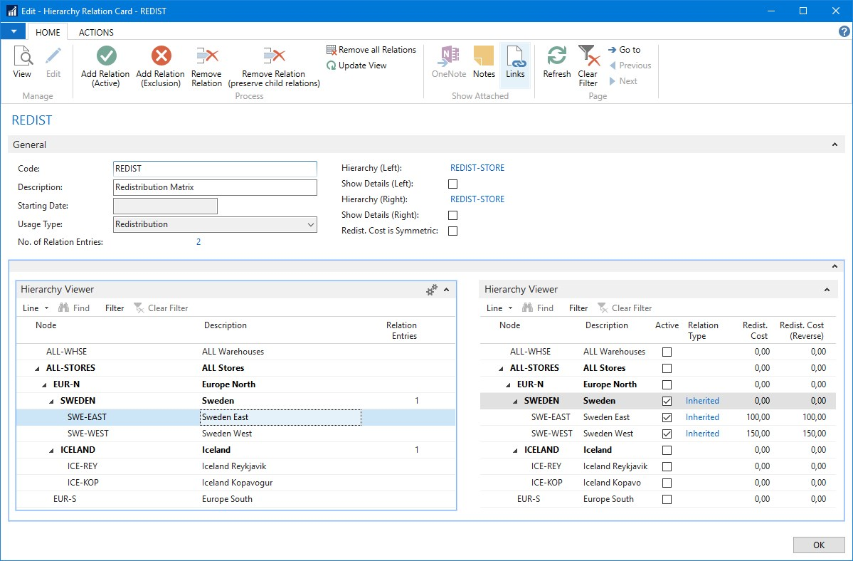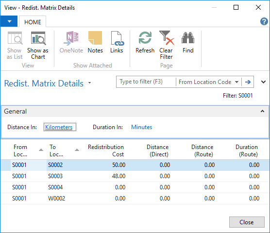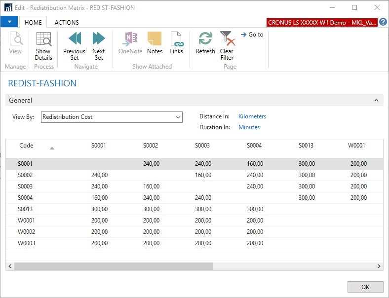 Store Stock Redistribution depends on a definition of which stores are allowed to transfer items to which stores. This concept is called the Redistribution Matrix and this matrix holds a list of locations, and the transportation cost, distance, and duration between them.