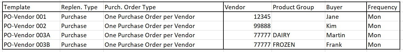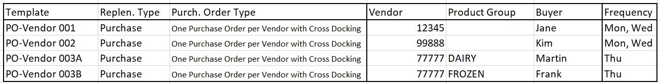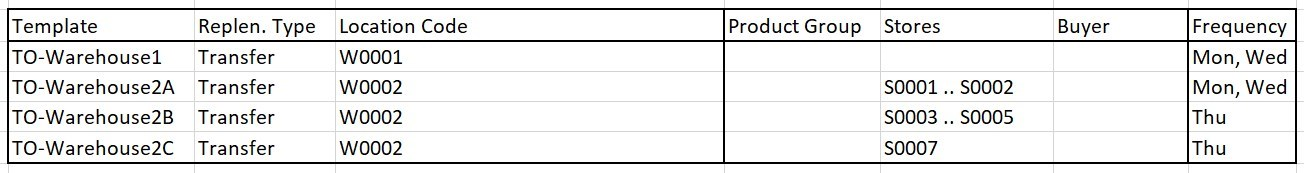• For the transfer part, Templates are very often split by stores or store groups that are replenished in the same interval. Buyer and Buyer Groups are also a separation criteria.