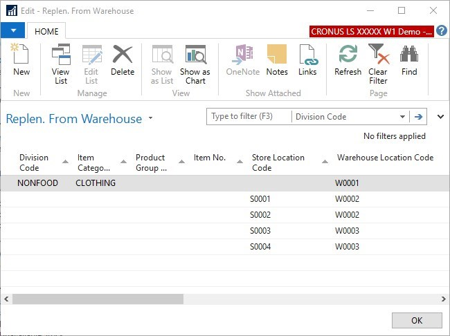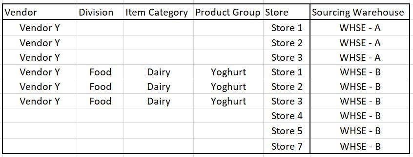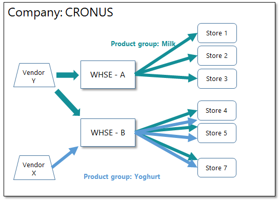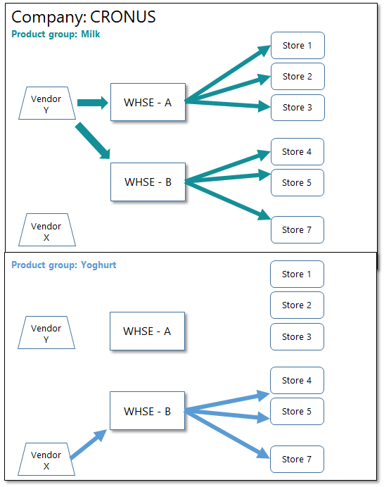 For the non-default warehouses, explicit definitions need to be set up: which store will be replenished by which warehouse for which items.