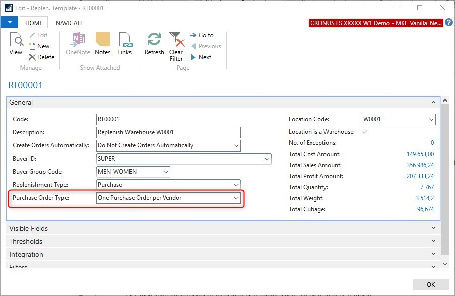 If multiple buyers or buyer groups work with Replenishment Journals and Templates it is good practice to split the results of the Replenishment calculation into groups that follow the department structure. This is done by filtering the Replenishment Templates.