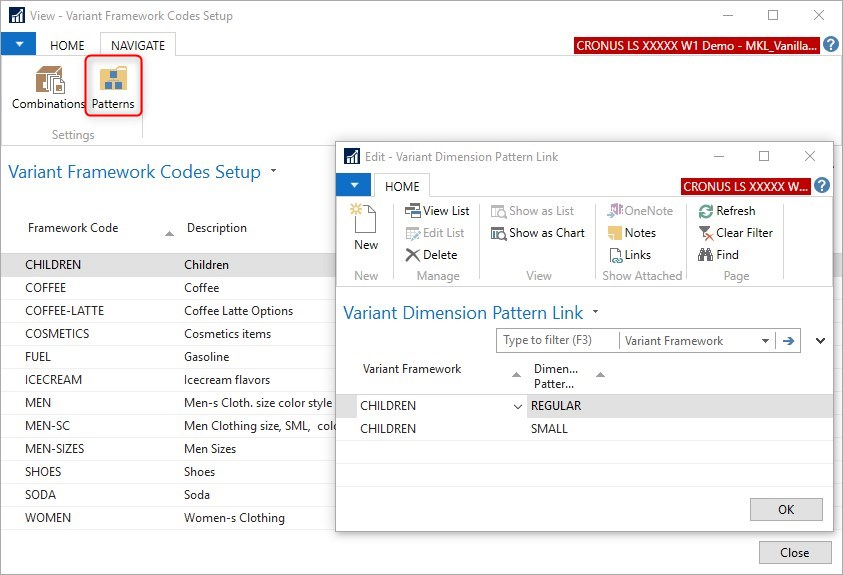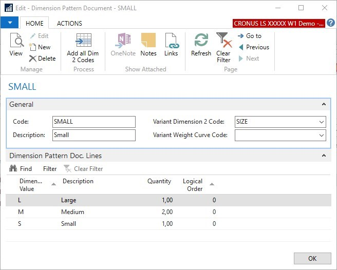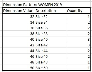 Dimension Patterns describe the quantities of dimension values (sizes, colors) which form a full lot or Dimension Pattern.