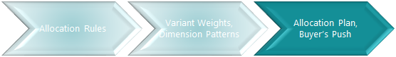 The functionalities Allocation Plan and Buyer's Push are used to distribute items to stores. Both depend on Allocation Rules to calculate the shares between the stores. If variants and variant dimensions are used, the Variant Weight and Dimension Pattern define the shares between the variant dimensions.