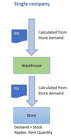 In this scenario, the entire Replenishment calculation takes place in one company. No special considerations are needed for the Replenishment Item Quantity and Replenishment Journal calculations.