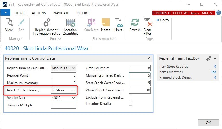 All items must have the value To Store set up in the field Purch. Order Delivery. This is set up on the Replenishment Control Data page: