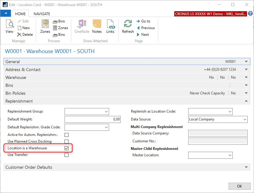 The warehouse location has to be set up as the default warehouse location in the Default Central Warehouse field on the Replenishment Setup page: