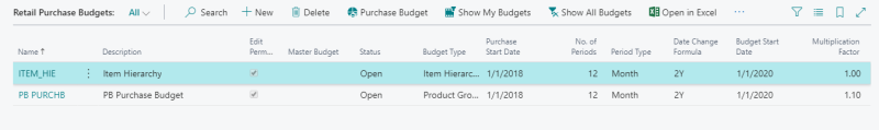 Note: You can only open a budget to which you have edit permission, this is indicated with the Edit Permission field. You can use the Show My Budgets and Show All Budgets actions to toggle the Retail Purchase Budget List to show only budgets which you have edit permission to, or to show all budgets. To learn more about budget permissions see Budget permission tasks below.