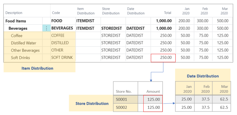 In Retail Sales Budgets, when the top-down approach is used, the budget values can be automatically distributed based on Budget Distribution Rules.