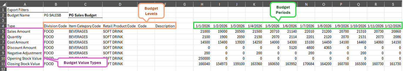 | Budget Periods | The budget is broken down into time periods which can be daily, weekly, monthly, quarterly, and yearly based on the Period Type. For example: 10 Months (No. of Periods = 10, Period Type = Month). There will be 10 columns in the Microsoft Excel file with each column representing 1 month. |