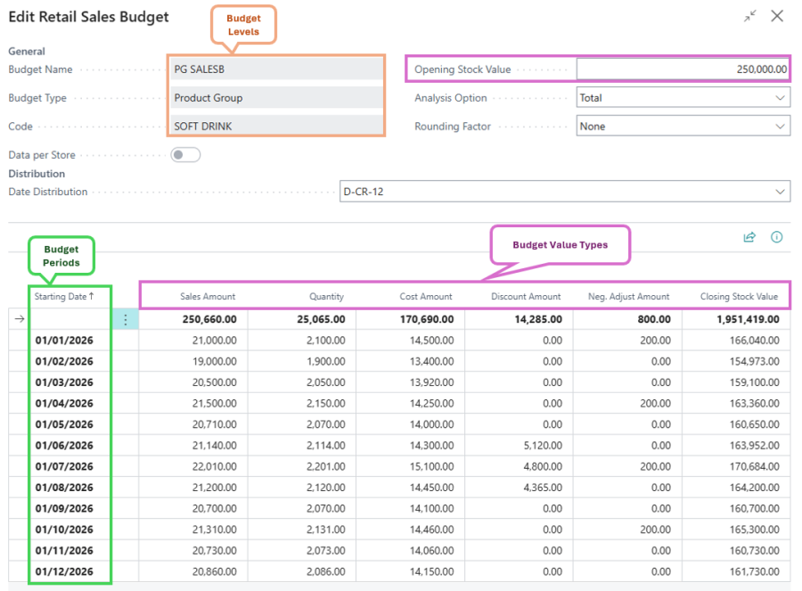 - Select the Budget Name and fill in the relevant filters on the Filter: Retail Sales Budget Entry FastTab, if needed.