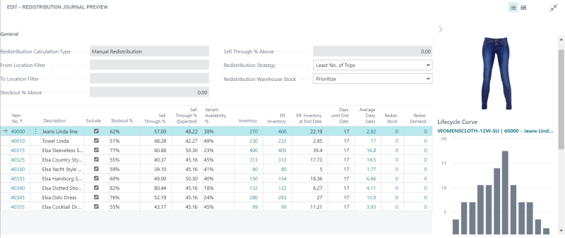 When the preview is calculated, the Show Redist. Preview action opens the Redistribution Journal Preview page where you can view the calculated sales performance indicators (such as Sell Through %, Demand until End Date, etc) for the items across stores. The locations are not classified into locations with demand or supply, that is, the Redist. Stock and Redist. Demand are not automatically calculated by the system.