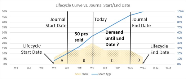 In the calculation the sold quantity is calculated within the calculation horizon (Journal Start Date until Journal End Date). The lifecycle is applied to understand, in which phase of the lifecycle the item is and what can be expect to be sold until the end of the calculation horizon (Journal End Date).