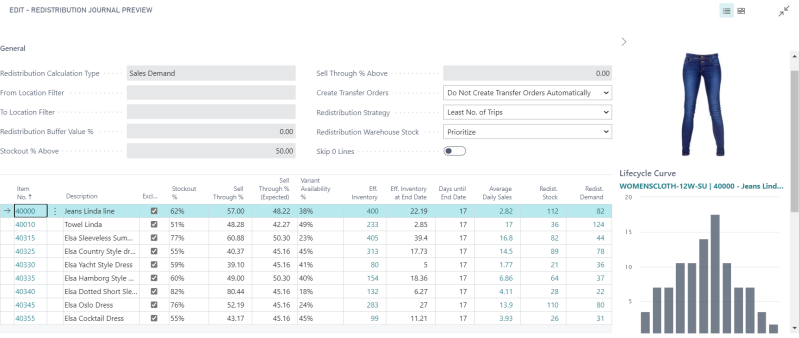From the Redist. Journal Preview, the Show Items Availability action opens the Retail Item Variant Availability by Location page. There, you view the variant availability and, together with the calculated sales factor (such as Sell Through %), you can determine how the variants can be redistributed among the stores and manually overwrite the calculated Redist. Stock and Redist. Demand, if needed.