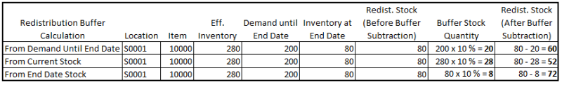 If the Effective Inventory at End Date is positive, the location has a supply. The Redist. Stock is the excessive stock at the end of the calculation period. - If the location has a supply, a Buffer % is subtracted from the Resist. Stock quantity to keep a safety quantity.