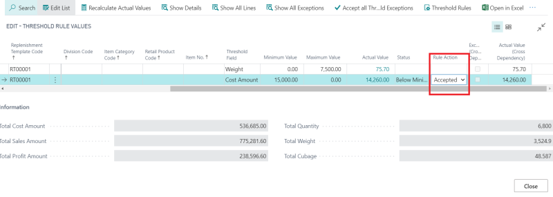 - On the right-hand side of the journal, in the Replen. Journal Factbox, go to the No. of Exceptions field and drill-down to open the Threshold Rule Values page.