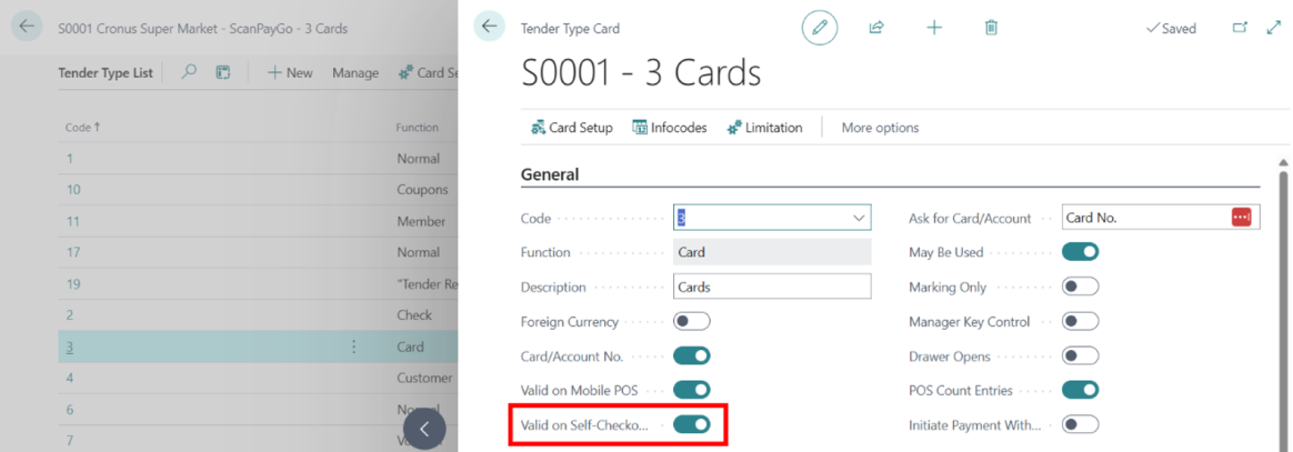 - Ensure the selected Tender Type in the Store Card → Cash Management → Tender Types has Valid on Self-Checkout POS checked.