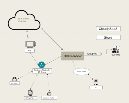 The Connector communicates with LS Central web services and implements the necessary mapping between LS Central and the specific SCO hardware device information, data, and functionality. It is not used when the LS Central POS itself runs as the user interface on a self-service checkout terminal.