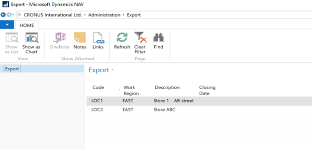 From the Administration menu the supervisor can review the status of the locations (within their region) and see the last Closing Date, which indicates if the period is available for exporting to the salary system. The manager of each location must close the period (from the role center) before the export can be executed.