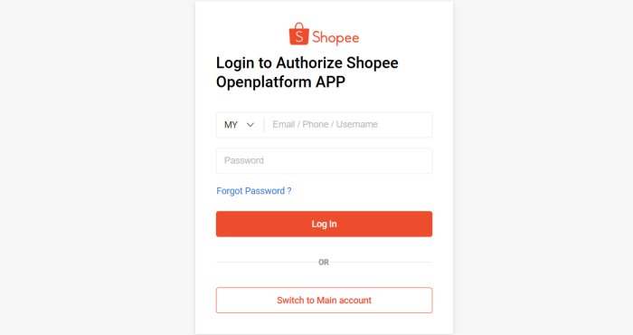 - Once you open theShop Authentication URL in a browser, the Shopee login page appears. Log in using your seller account credentials.