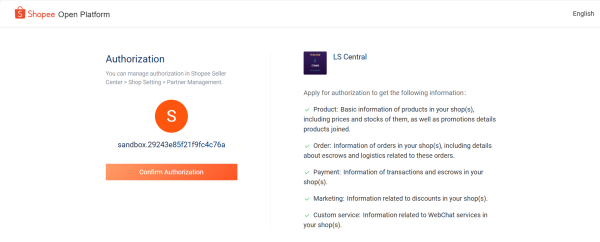 - After logging in, you see a screen prompting you to authorize the LS Central Shopee App. Confirm the authorization to proceed.