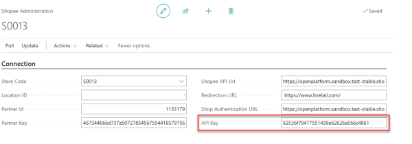 | API Key | The Shopee Admin API access token key is generated automatically after app authorization. You are redirected to lsretail.com to copy the code, which must be entered in the API Key field. |